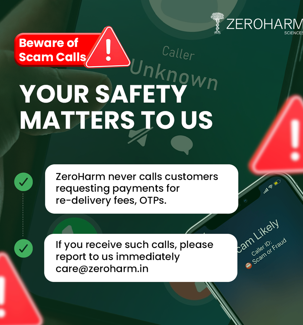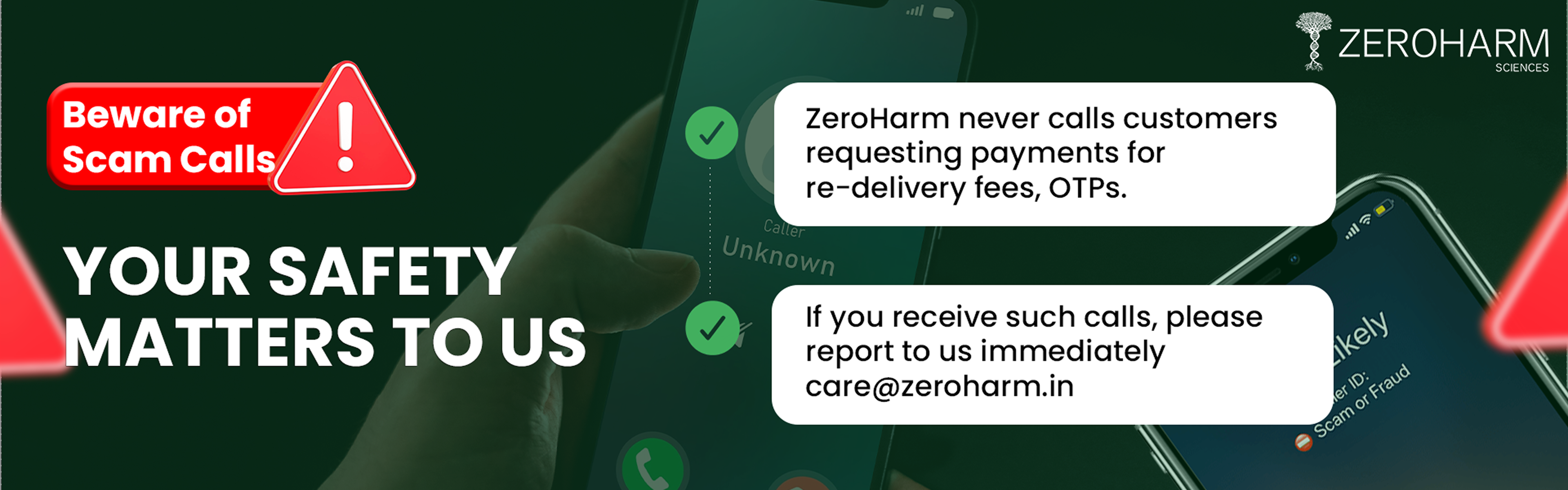 ⚠️ ZeroHarm never calls customers requesting payments for re-delivery fees, OTPs. ⚠️ If you receive such calls, please report to us immediately care@zeroharm.in
