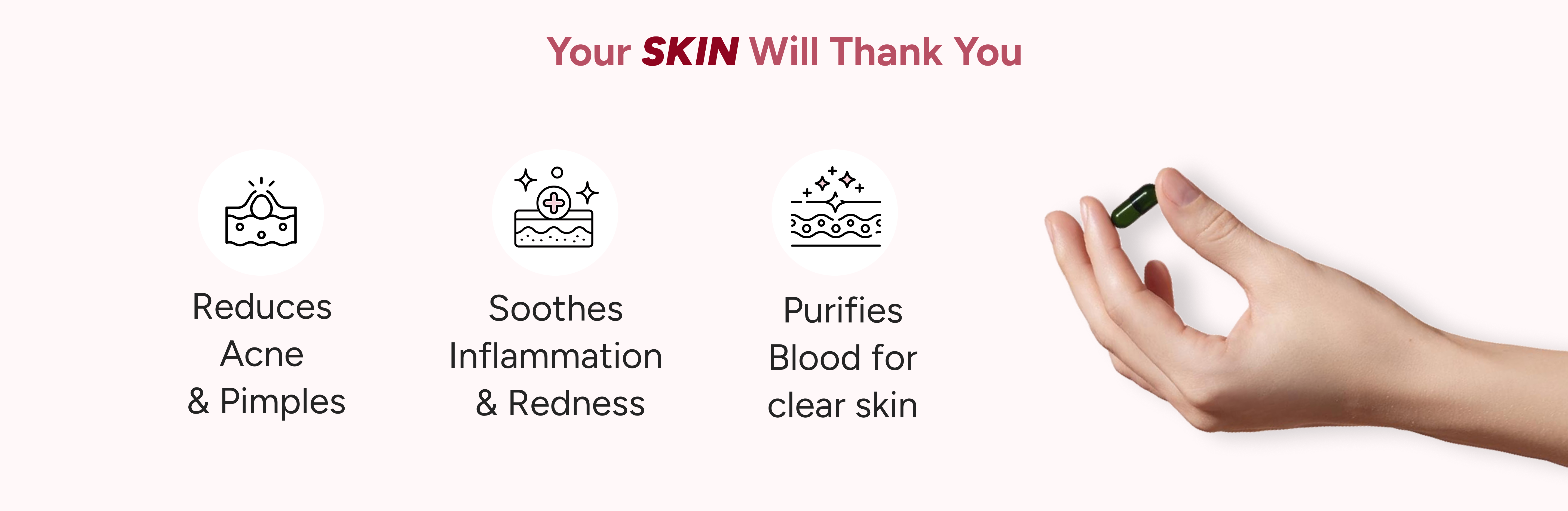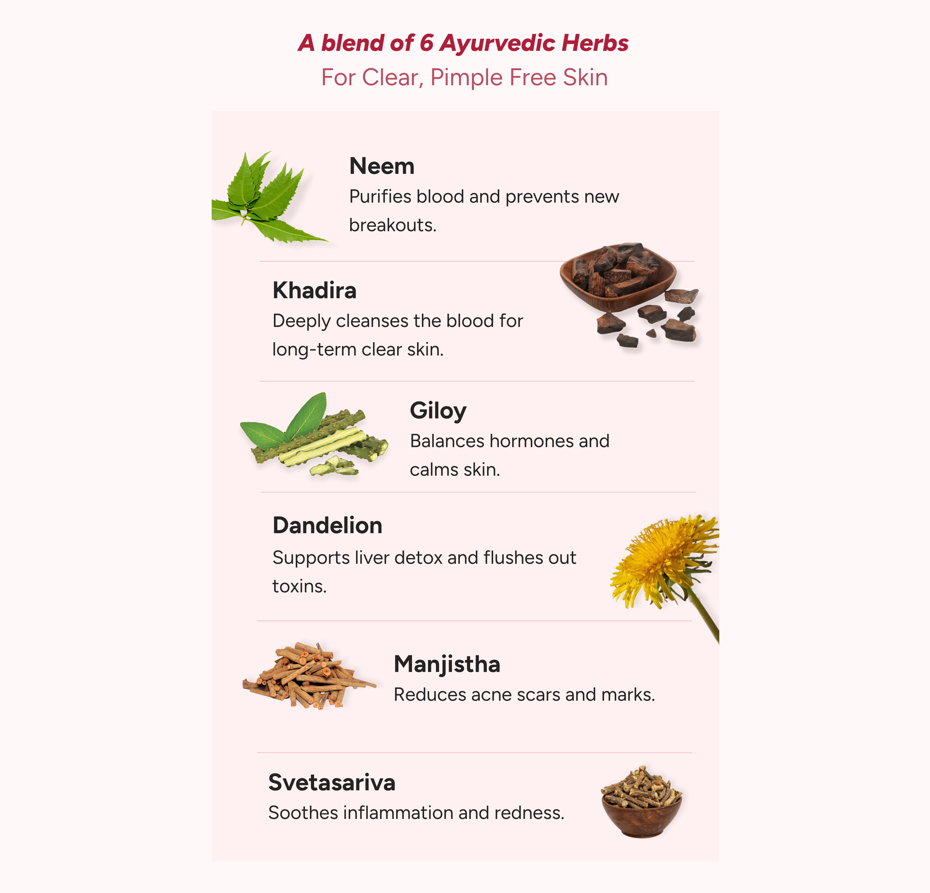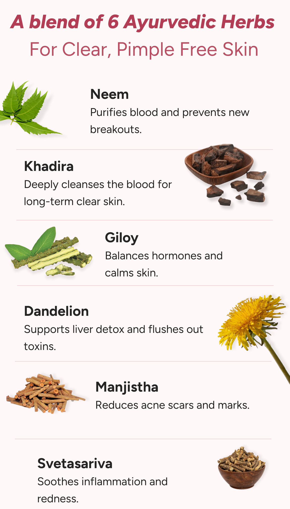 It contains Neem, Manjistha, Giloy, Dandelion, Svetasariva, and Khadira β all proven Ayurvedic herbs for acne and skin health.
