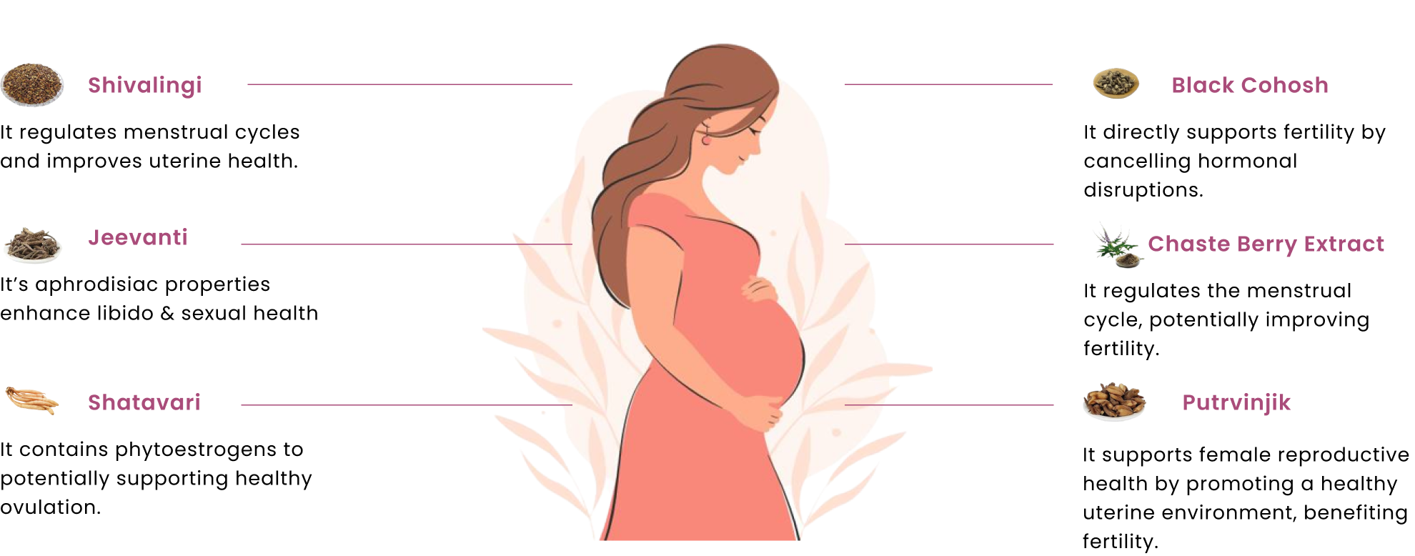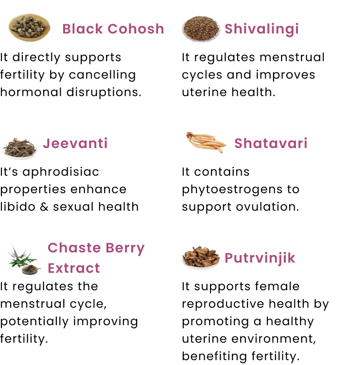 The tablets contain Shatavari (96 mg), Jeevanti (63 mg), Shivalingi (59 mg), Putravinjik (56 mg), Chaste berry extract (63 mg), and Black cohosh (63 mg).
