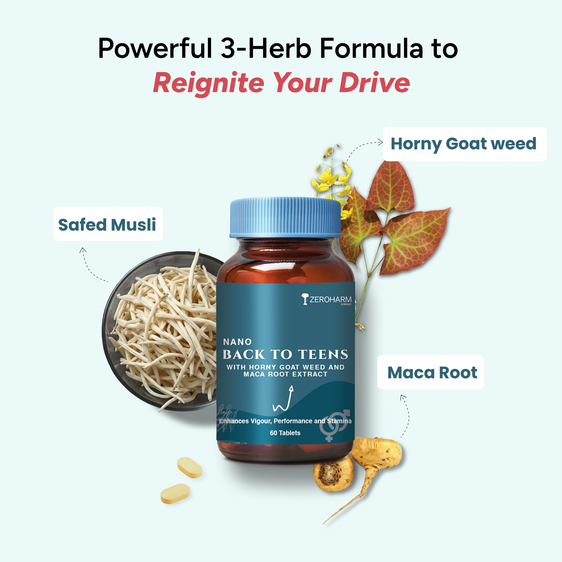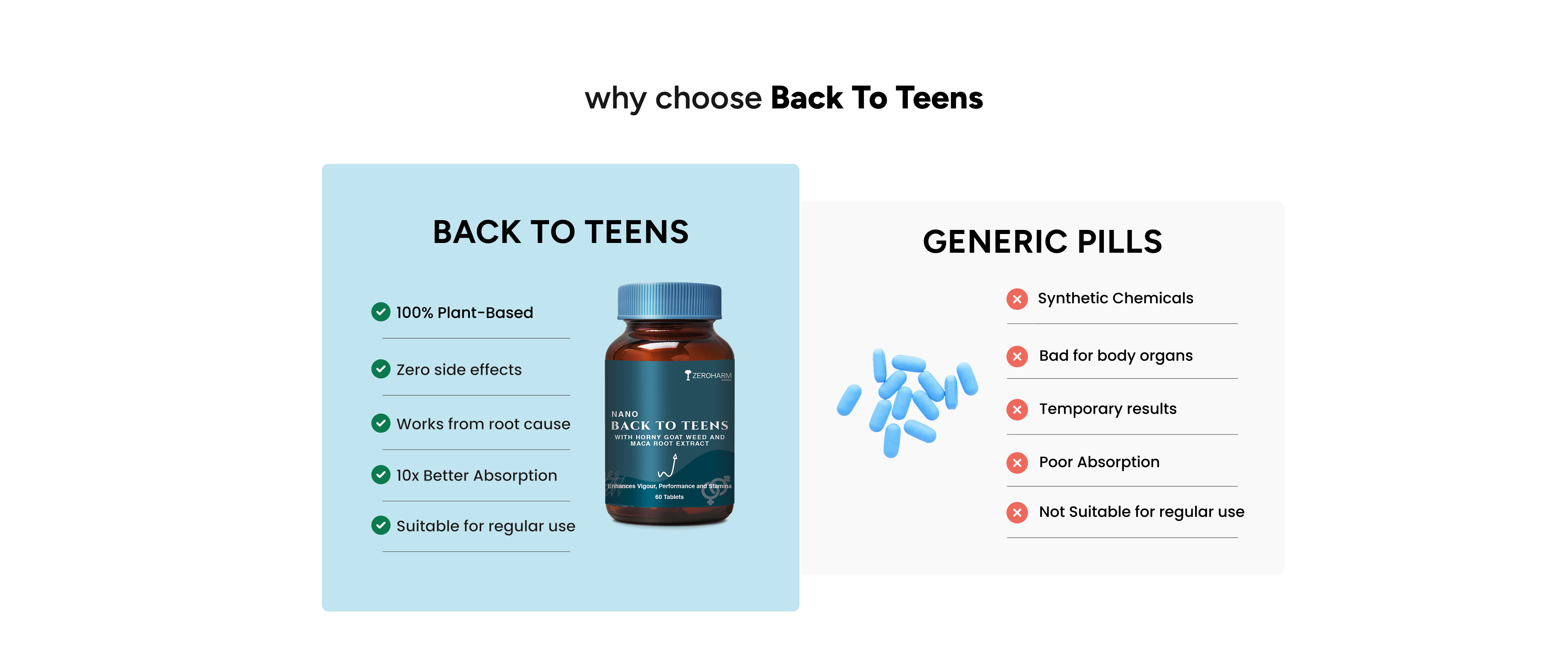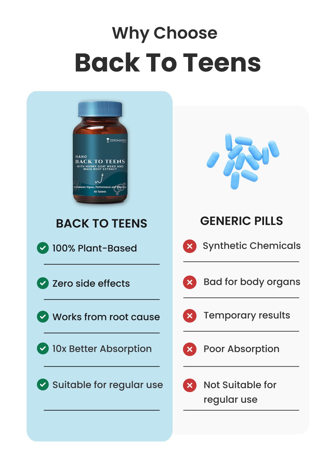 Back To Teens Tablets are natural performance-boosting supplements made with Horny Goat Weed, Maca Root, and Safed Musli. They help improve libido, energy, stamina, and overall vitality, while also supporting concerns like erectile dysfunction (ED) and premature ejaculation (PE). Trusted by 15,000+ customers, Back To Teens is designed exclusively for men.