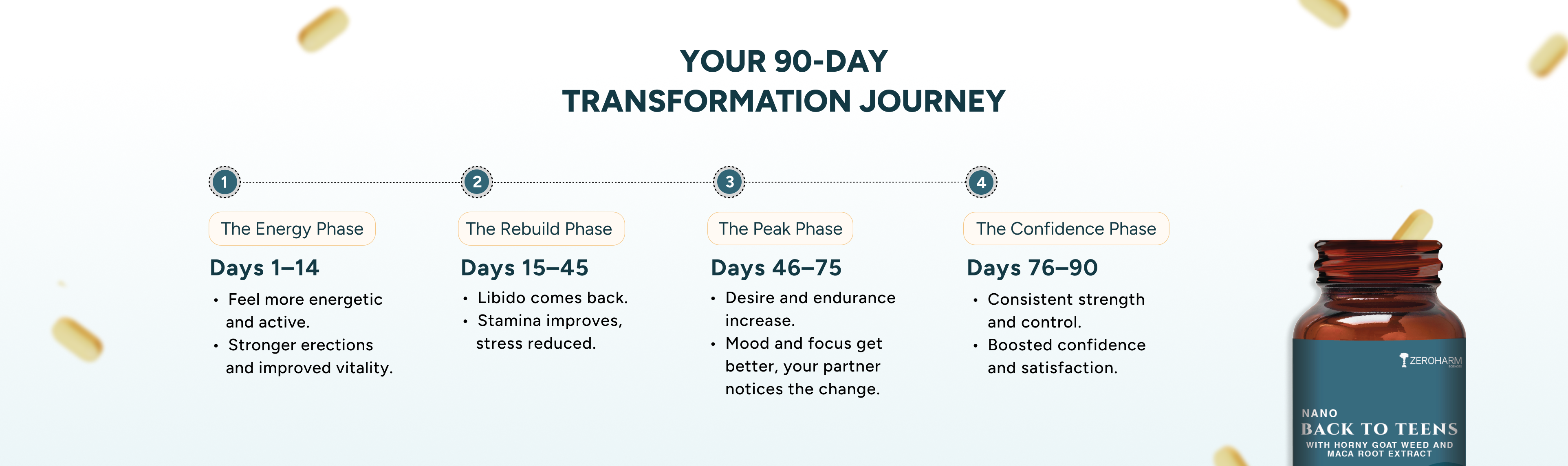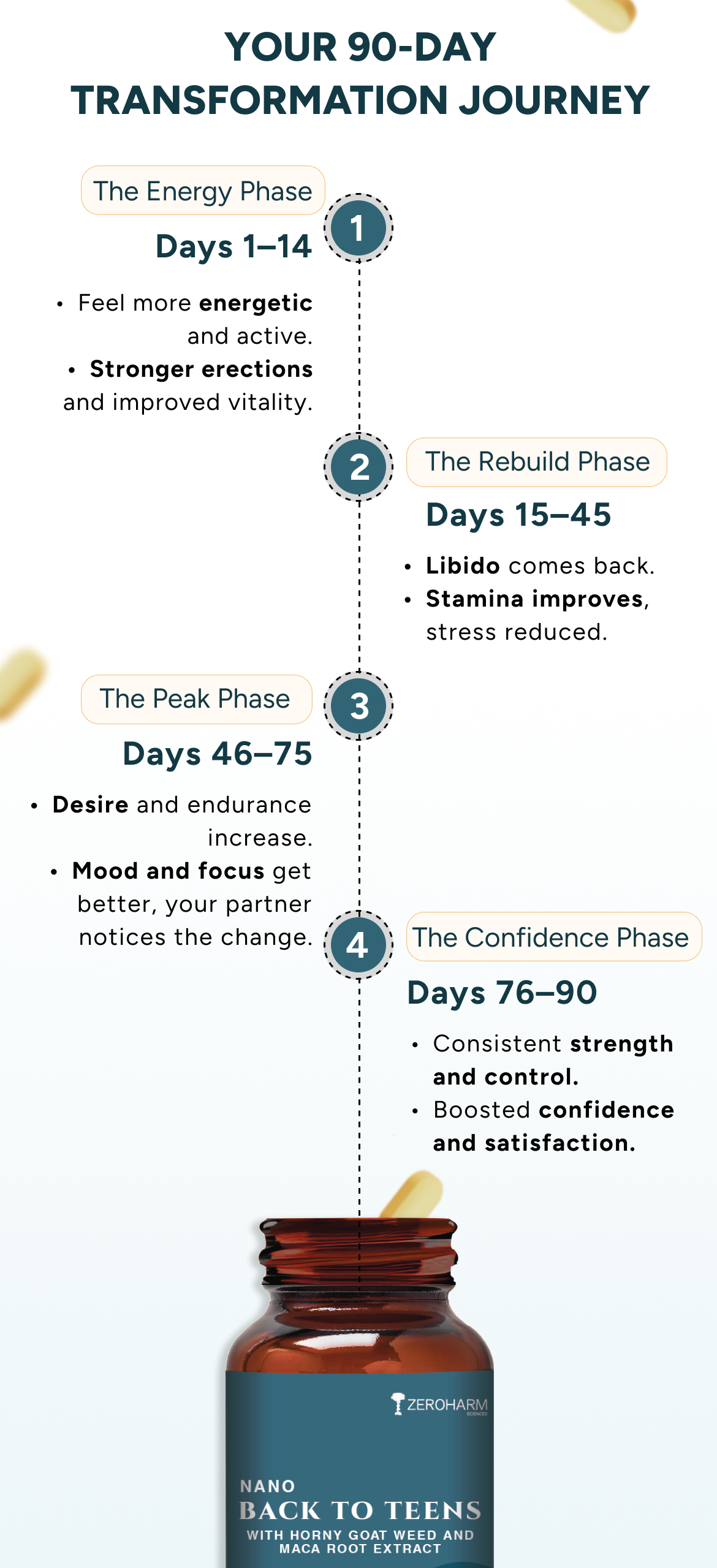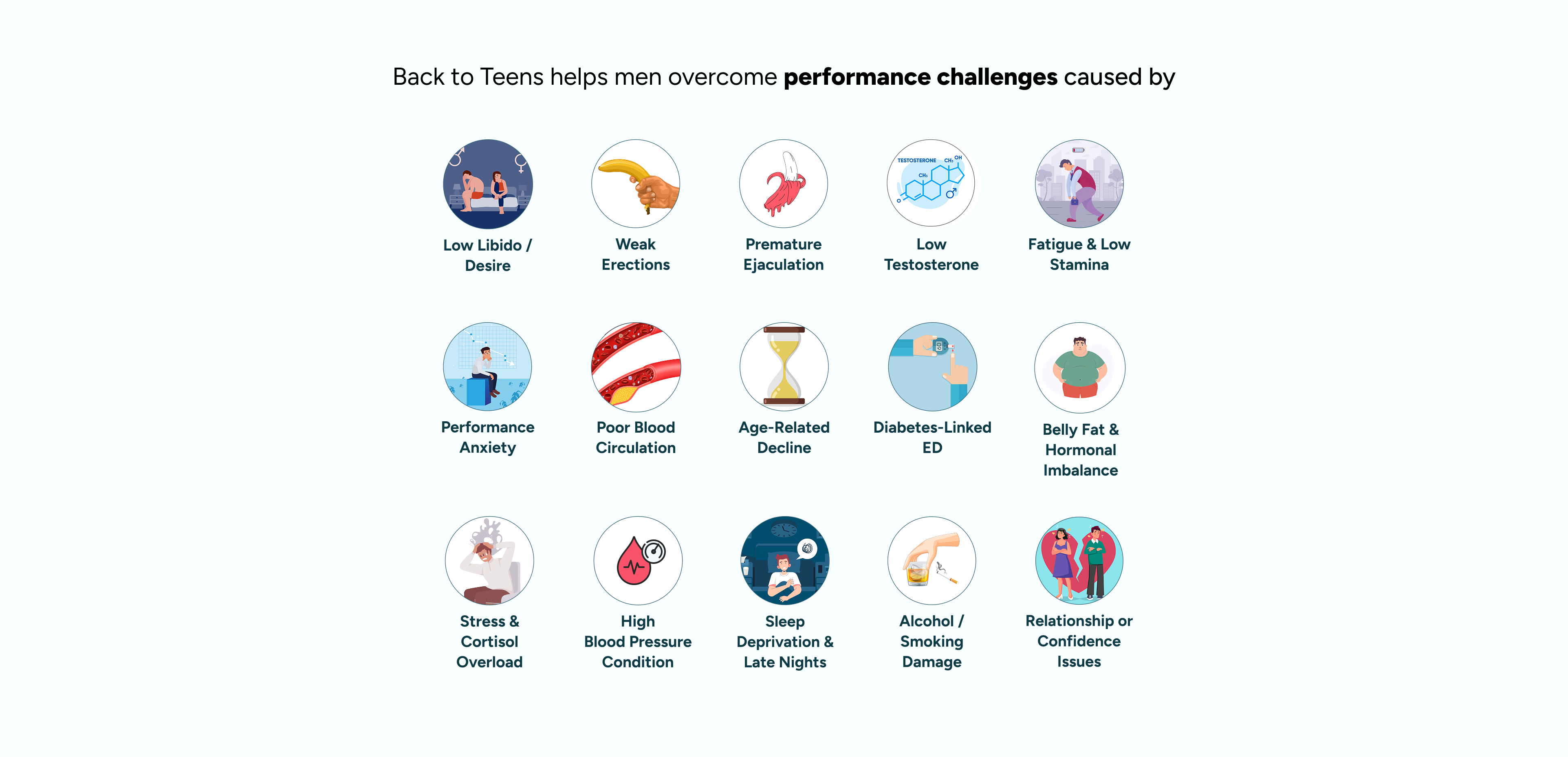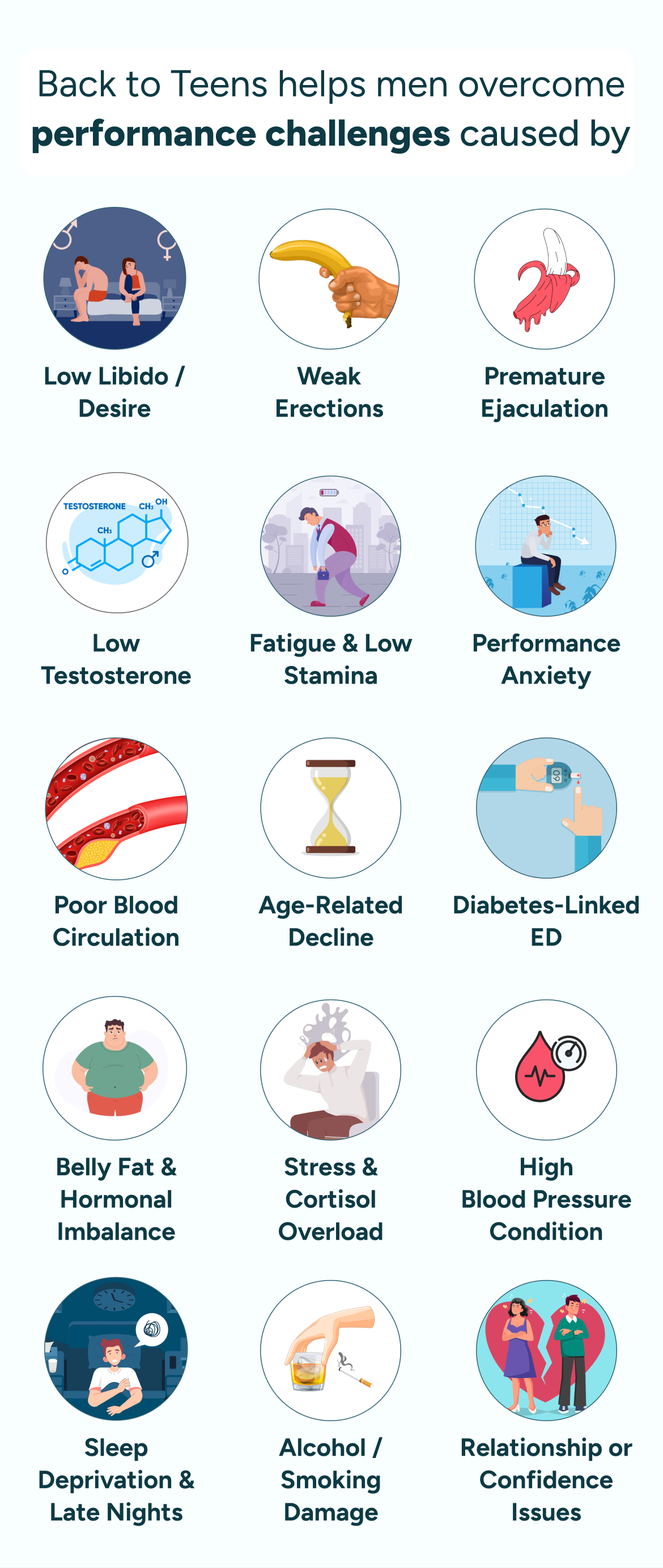 Back To Teens Tablets are natural performance-boosting supplements made with Horny Goat Weed, Maca Root, and Safed Musli. They help improve libido, energy, stamina, and overall vitality, while also supporting concerns like erectile dysfunction (ED) and premature ejaculation (PE). Trusted by 15,000+ customers, Back To Teens is designed exclusively for men.