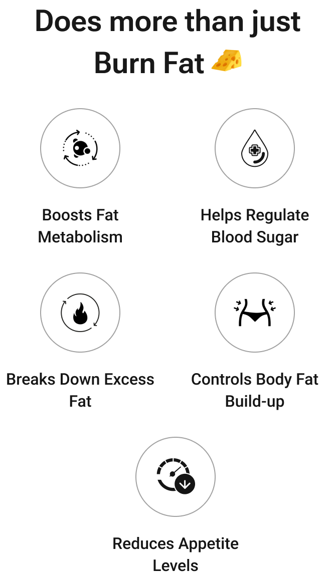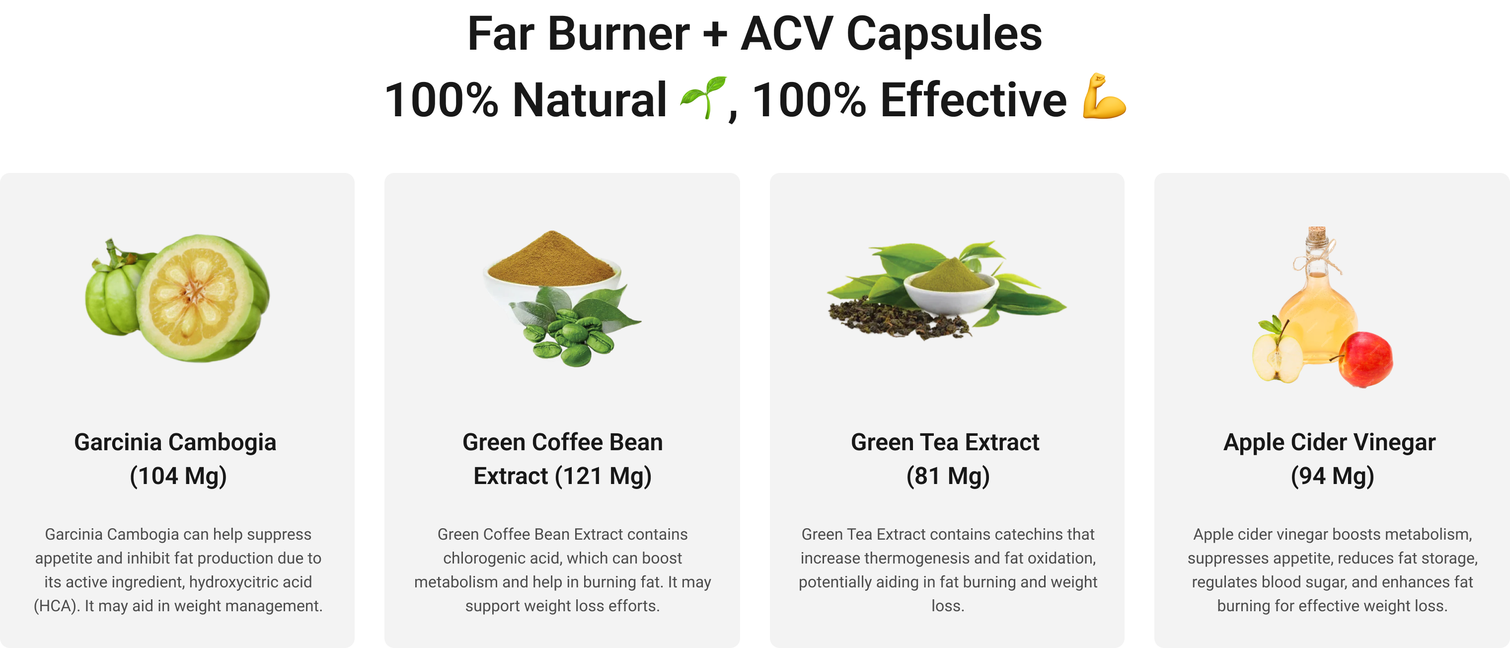 Garcinia Cambogia: 104 mg Green Coffee Bean Extract: 121 mg Green Tea Extract: 81 mg Apple Cider Vinegar: 94 mg These ingredients work together to control appetite, boost metabolism, and support fat burning in the body.